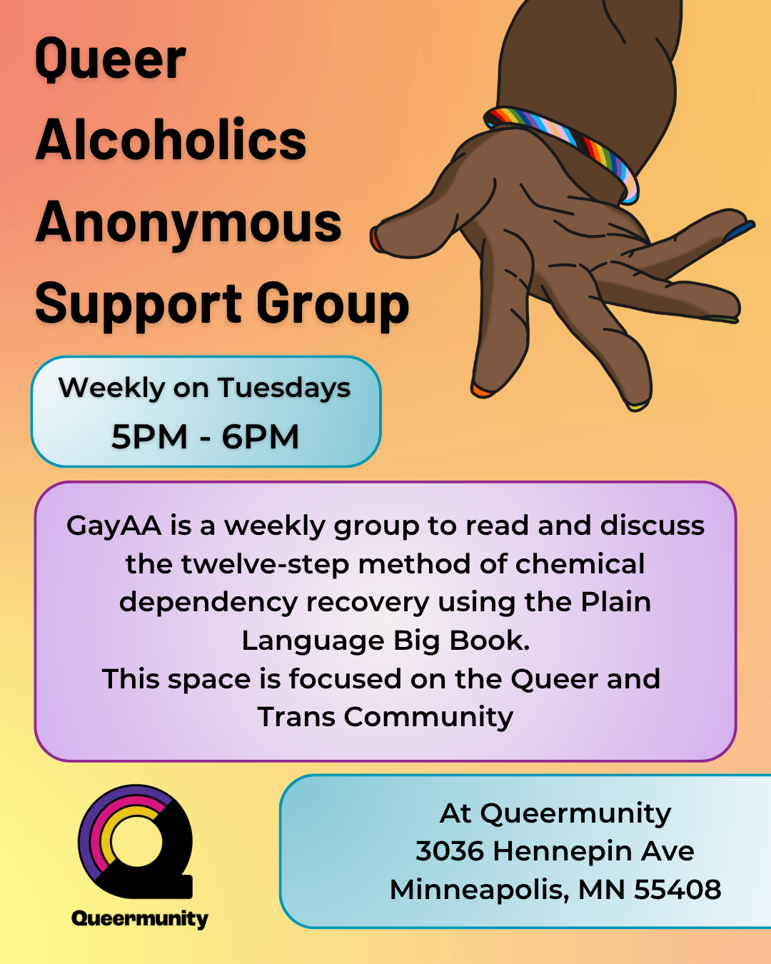 GayAA is a weekly group to read and discuss the twelve-step method of chemical dependency recovery using the Plain Language Big Book, a version of the original AA text adapted to be more inclusive.