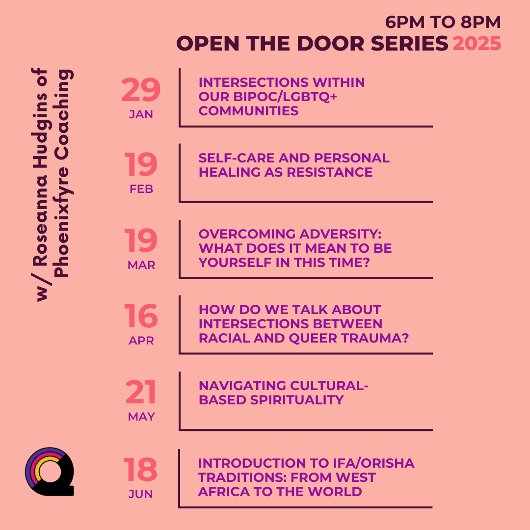Open the Door is an intergenerational series of monthly discussions focused on exploring the intersections of identity, healing, and community within BIPOC and LGBTQ+ experiences. Each session invites participants to engage in meaningful conversations around themes such as personal healing as resistance, navigating cultural-based spirituality, overcoming adversity, and understanding the interplay between racial and queer trauma. Each session is open to everyone.